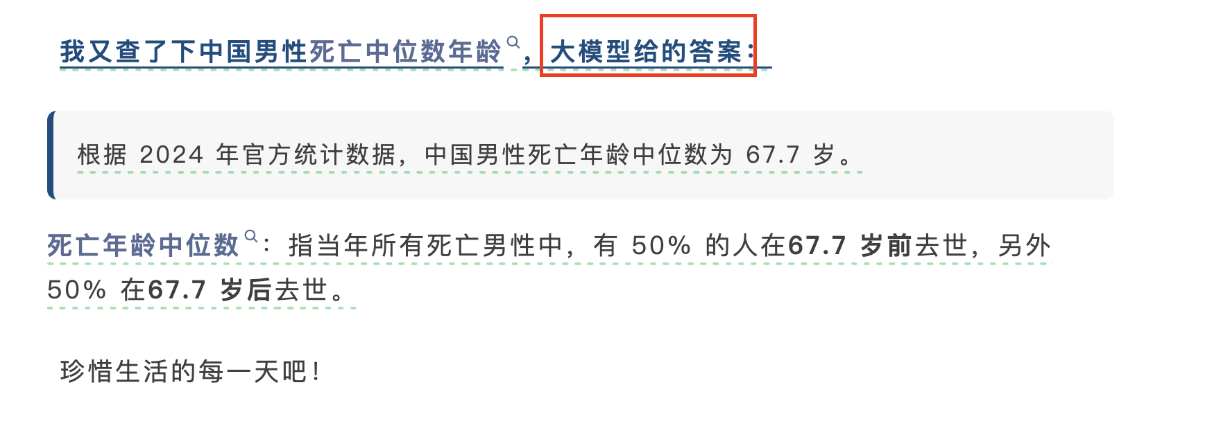 那么,“一半中国男性活不到67.7岁”究竟来自哪里呢?可能如一些自媒体所称:这一数据来自AI。